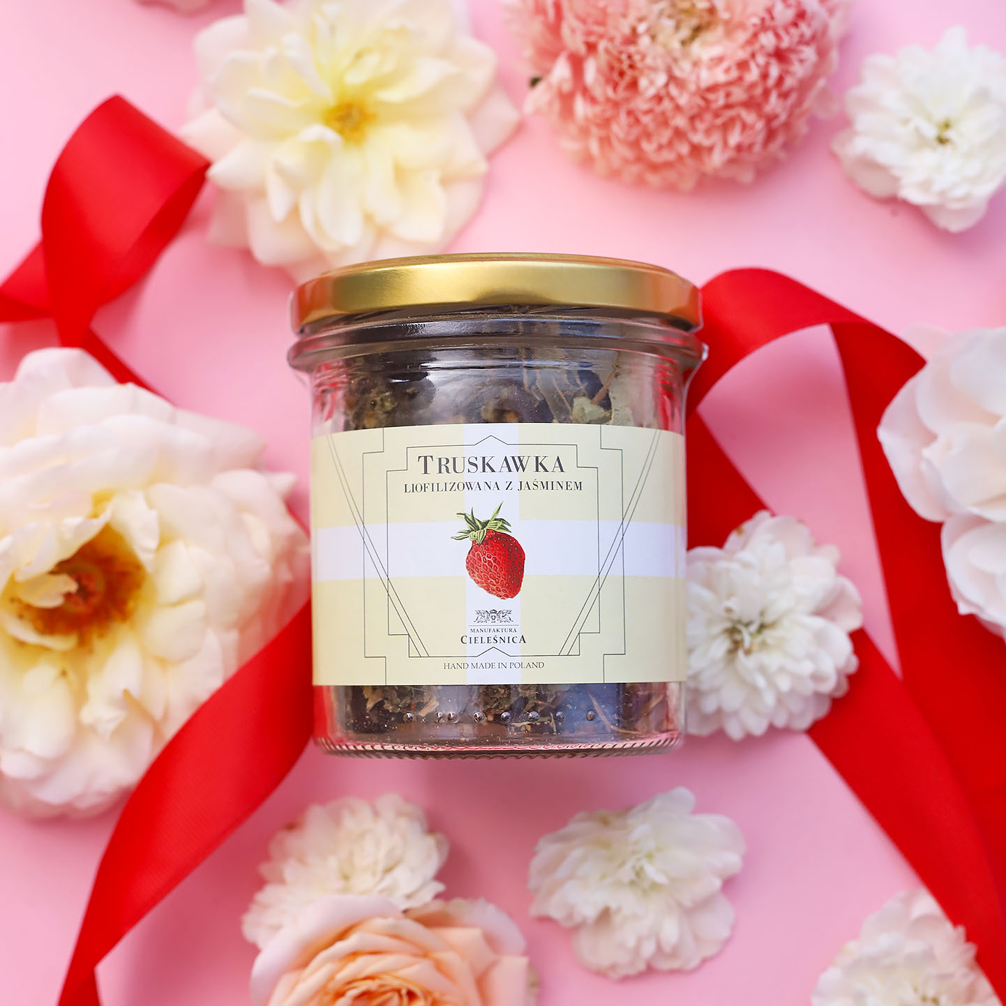 Cudownie aksamitna zielona herbata z soczystych truskawek i jaśminu, której smak i aromat przenosi nas do tajemniczego, letniego ogrodu na lubelszczyźnie, w którym panuje spokój i harmonia. Herbata nie jest sztucznie aromatyzowana, a pyszny smak i zapach zawdzięcza jedynie naturalnym składnikom.